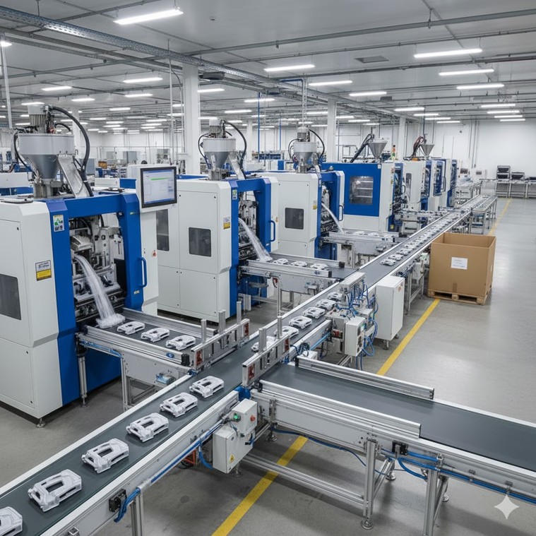 Optimized production by installing a conveyor system to link two injection molding machines to one automation unit, successfully reducing idle time and boosting overall equipment effectiveness (OEE). The design enables precise control of parts arriving from both injection molding machines to prevent jams. Additionally, it allows the machines to continue placing parts on the conveyor even during automation downtime, which has successfully eliminated 90% of the Work-In-Progress (WIP) that previously accumulated in Gaylords